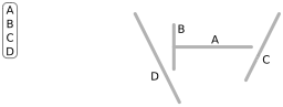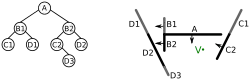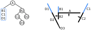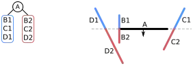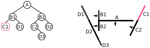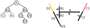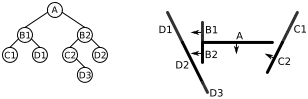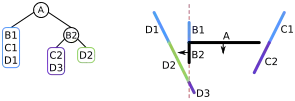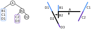 | L'espace contient quatre segments de droite {A, B, C, D} ; s'il s'agissait d'un problème de rendu 3D, ce seraient des polygones formant une « scène ». Dans l'arbre, les nœuds de l'arbre sont dans des cercles, et les listes d'objets devant ou derrière sont dans des rectangles arrondis. Le côté avant de chaque segment est indiqué par une flèche | ![]() | |