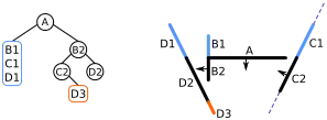 | vii. | Nous traitons les segments situés devant B1. Il n'y a qu'un seul segment, D1, nous créons donc un nœud enfant de B1 pour l'y mettre. | ![]() |
