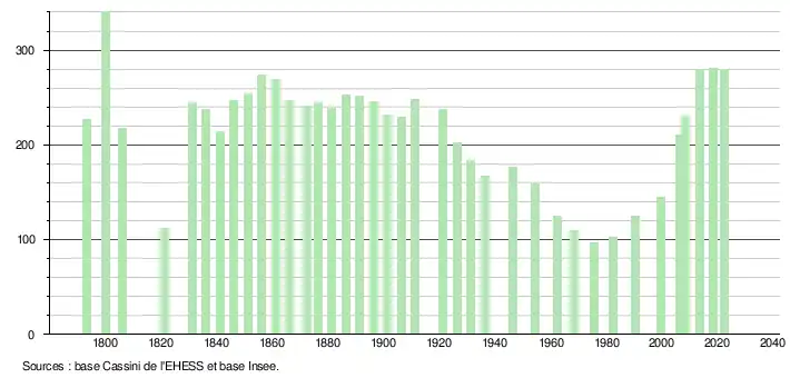 L'évolution du nombre d'habitants est connue à travers les recensements de la population effectués dans la commune depuis 1793. Pour les communes de moins de 10 000 habitants, une enquête de recensement portant sur toute la population est réalisée tous les cinq ans, les populations de référence des années intermédiaires étant quant à elles estimées par interpolation ou extrapolation[22]. Pour la commune, le premier recensement exhaustif entrant dans le cadre du nouveau dispositif a été réalisé en 2008[23].