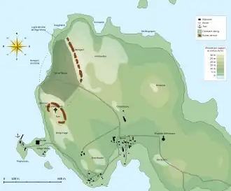 Les différents types de tombes ne sont pas répartis uniformément dans les différents sites, avec par exemple les crémations surtout à Hemlanden et au sud du fort, tandis que les corps non brûlés et/ou les tombes à chambres sont surtout près du mur d'enceinte à Hemlanden et entre le fort et les Terres Noires[A 15]. De même l'âge des sépultures est non uniforme, avec les plus anciennes typiquement au sud du fort, tandis que les plus récentes (Xe siècle) sont à Hemlanden[A 15].