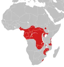 Cette espèce se rencontre au Nigéria, au Cameroun, au Tchad, en République centrafricaine, au Soudan du Sud, en Guinée équatoriale, au Gabon, au Congo-Brazzaville, en Ouganda, en Angola, en Zambie, au Togo, dans l'est du Zimbabwe, au Mozambique, dans le nord-est du Kwazulu-Natal en Afrique du Sud selon Reptile Database[1]. Elle est aussi répertoriée au Congo-Kinshasa et en Tanzanie[3].