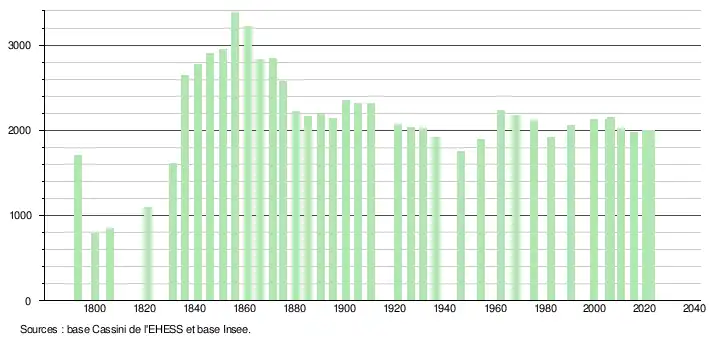 L'évolution du nombre d'habitants est connue à travers les recensements de la population effectués dans la commune depuis 1793. Pour les communes de moins de 10 000 habitants, une enquête de recensement portant sur toute la population est réalisée tous les cinq ans, les populations de référence des années intermédiaires étant quant à elles estimées par interpolation ou extrapolation[45]. Pour la commune, le premier recensement exhaustif entrant dans le cadre du nouveau dispositif a été réalisé en 2005[46].