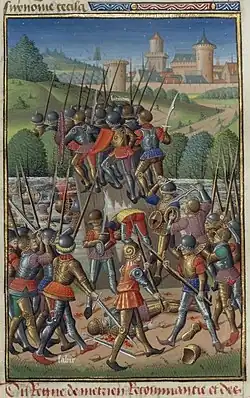 Bataille du Confluent, entre le roi arverne Bituit et les troupes romaines. Miniature médiévale issue du Speculum historiale de Vincent de BeauvaisXIVe siècle, BnF.