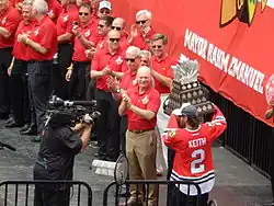 Stan Mikita dans le maillot rouge des Blackhawks qui salut la foule depuis un balcon