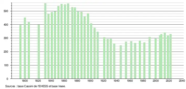 L'évolution du nombre d'habitants est connue à travers les recensements de la population effectués dans la commune depuis 1793. Pour les communes de moins de 10 000 habitants, une enquête de recensement portant sur toute la population est réalisée tous les cinq ans, les populations de référence des années intermédiaires étant quant à elles estimées par interpolation ou extrapolation[17]. Pour la commune, le premier recensement exhaustif entrant dans le cadre du nouveau dispositif a été réalisé en 2008[18].