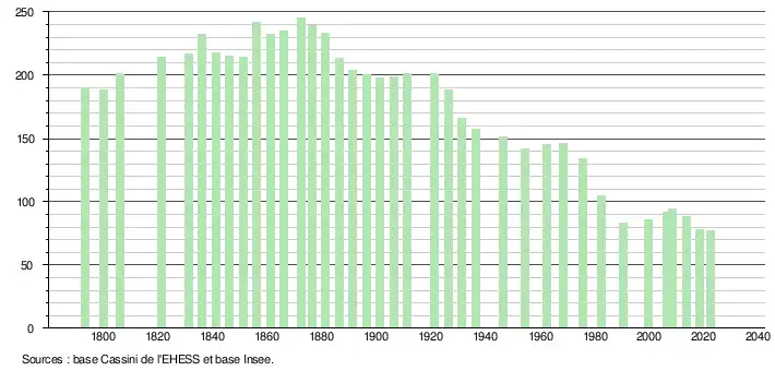 L'évolution du nombre d'habitants est connue à travers les recensements de la population effectués dans la commune depuis 1793. Pour les communes de moins de 10 000 habitants, une enquête de recensement portant sur toute la population est réalisée tous les cinq ans, les populations de référence des années intermédiaires étant quant à elles estimées par interpolation ou extrapolation[17]. Pour la commune, le premier recensement exhaustif entrant dans le cadre du nouveau dispositif a été réalisé en 2008[18].
