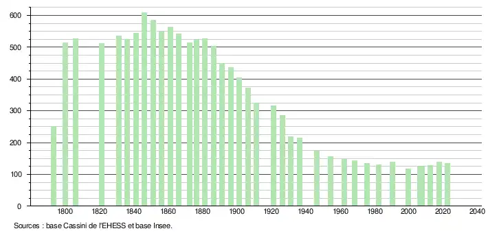 L'évolution du nombre d'habitants est connue à travers les recensements de la population effectués dans la commune depuis 1793. Pour les communes de moins de 10 000 habitants, une enquête de recensement portant sur toute la population est réalisée tous les cinq ans, les populations de référence des années intermédiaires étant quant à elles estimées par interpolation ou extrapolation[28]. Pour la commune, le premier recensement exhaustif entrant dans le cadre du nouveau dispositif a été réalisé en 2007[29].