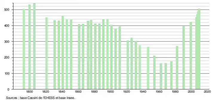 L'évolution du nombre d'habitants est connue à travers les recensements de la population effectués dans la commune depuis 1793. À partir du , les populations légales des communes sont publiées annuellement dans le cadre d'un recensement qui repose désormais sur une collecte d'information annuelle, concernant successivement tous les territoires communaux au cours d'une période de cinq ans. Pour les communes de moins de 10 000 habitants, une enquête de recensement portant sur toute la population est réalisée tous les cinq ans, les populations légales des années intermédiaires étant quant à elles estimées par interpolation ou extrapolation[5]. Pour la commune, le premier recensement exhaustif entrant dans le cadre du nouveau dispositif a été réalisé en [6],[Note 1].