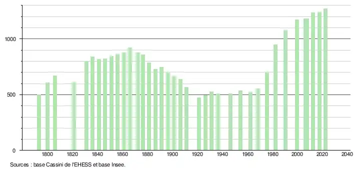 L'évolution du nombre d'habitants est connue à travers les recensements de la population effectués dans la commune depuis 1793. Pour les communes de moins de 10 000 habitants, une enquête de recensement portant sur toute la population est réalisée tous les cinq ans, les populations de référence des années intermédiaires étant quant à elles estimées par interpolation ou extrapolation[12]. Pour la commune, le premier recensement exhaustif entrant dans le cadre du nouveau dispositif a été réalisé en 2007[13].