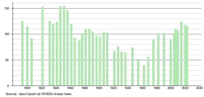 L'évolution du nombre d'habitants est connue à travers les recensements de la population effectués dans la commune depuis 1793. Pour les communes de moins de 10 000 habitants, une enquête de recensement portant sur toute la population est réalisée tous les cinq ans, les populations de référence des années intermédiaires étant quant à elles estimées par interpolation ou extrapolation[31]. Pour la commune, le premier recensement exhaustif entrant dans le cadre du nouveau dispositif a été réalisé en 2004[32].