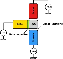 Le dispositif le plus simple dans lequel l'effet du blocage de Coulomb peut être observé est le transistor dit à un électron. Il se compose de deux électrodes connues sous le nom de drain et de source, reliées par des jonctions tunnel à une électrode commune avec une faible auto-capacité, connue sous le nom d'îlot. Le potentiel électrique de l'îlot peut être réglé par une troisième électrode, appelée porte, qui est couplée par capacité à l'îlot.