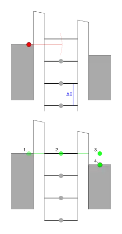 Lorsqu'une tension positive est appliquée à l'électrode de porte, les niveaux d'énergie de l'électrode d'îlot sont abaissés. Ainsi maintenant, un électron de l'électrode de source (voir figure en vert 1.) peut pénétrer dans l'îlot (2.), occupant un niveau d'énergie précédemment vacant car anciennement trop élevé. À partir de là, il peut pénétrer dans l'électrode de drain (3.) où il se diffuse de façon inélastique et atteint le niveau de Fermi de l'électrode de drain (4.).