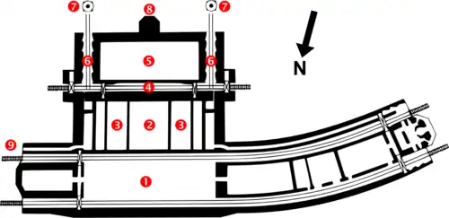 Le côté nord de la structure devait s'étendre au-dessus d'une gare ① reliée à la ligne Calais-Saint-Omer par un embranchement de 1,2 km depuis Watten. Les missiles, les ogives et les autres équipements seraient acheminés jusque dans la gare et transportés sur des chariots jusqu'au cœur du bunker. Les fusées y seraient assemblées, placées à la verticale, approvisionnées en carburant et armées ④. Elles seraient ensuite déplacées vers la face sud de la structure où elles seraient déployées sur un pas de tir ⑦. Ces couloirs vers l'extérieur ⑥ n'avaient pas de portes et des chicanes étaient prévues pour atténuer le souffle du lancement des fusées[19]. Les tirs seraient surveillés depuis une tour de contrôle située au centre de la face sud du bâtiment ⑧ et surplombant les pas de tir[4].