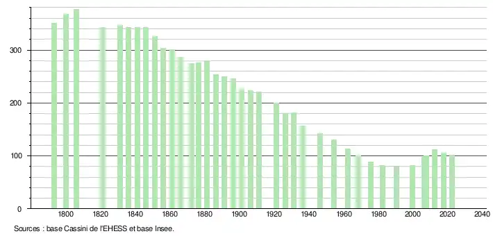 L'évolution du nombre d'habitants est connue à travers les recensements de la population effectués dans la commune depuis 1793. Pour les communes de moins de 10 000 habitants, une enquête de recensement portant sur toute la population est réalisée tous les cinq ans, les populations de référence des années intermédiaires étant quant à elles estimées par interpolation ou extrapolation[13]. Pour la commune, le premier recensement exhaustif entrant dans le cadre du nouveau dispositif a été réalisé en 2007[14].