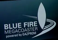 En octobre 2009, Europa-Park annonce que l'attraction sera sponsorisée par l'entreprise russe Gazprom[23] ; son nom devient Blue Fire megacoaster powered by Gazprom. Le nom de l'attraction et son logo représentent ainsi la flamme bleue du gaz naturel. Un bâtiment situé à côté de l'attraction est entièrement consacré à Gazprom et l'univers de l'énergie, une partie de la file d'attente passe dans ce hall et traverse des salles avec des écrans où sont projetées des animations numériques de l'entreprise.