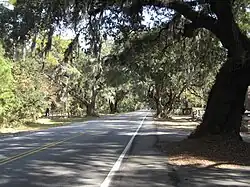 Dans le sens des aiguilles d'une montre, en partant d'en haut : la rivière May, la maison Heyward, la rue Carecore Drive, un bureau de poste, l'ile Myrtle, et le magasin historique The Store. | ||||