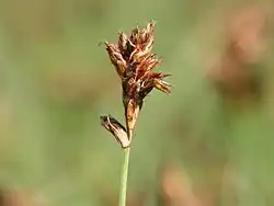 Les épillets, roussâtres, longs de 5 à 7 mm, sont pauciflores, nombreux et sessiles, en épi terminal, oblong, distique, comprimé, dépassé ou non par une bractée ; les écailles sont mucronées, à plusieurs nervures. Il y a deux stigmates, et trois à six soies scabres, deux fois plus longues que l'akène ovoïde-comprimé mucroné.