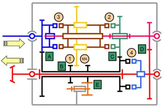 La marche arrière ajoute un engrenage E en intercalant un pignon dans la chaîne cinématique de la 1re. Ceci impose un rapport identique à celui de première avec une inversion supplémentaire.