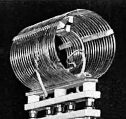 Une « bobine à rouleau », une inductance RF à noyau d'air réglable utilisée dans les circuits accordés des émetteurs radio. L'un des contacts avec la bobine est réalisé par la petite roue rainurée, qui se déplace sur le fil. La rotation de l'arbre fait tourner la bobine, déplaçant la roue de contact vers le haut ou vers le bas de la bobine, permettant ainsi d'introduire plus ou moins de tours de bobine dans le circuit, afin de modifier l'inductance.