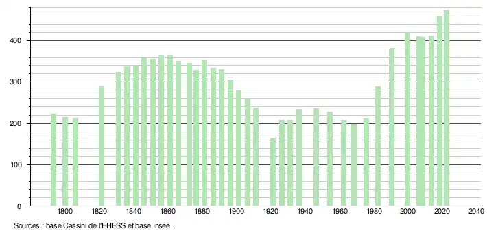 L'évolution du nombre d'habitants est connue à travers les recensements de la population effectués dans la commune depuis 1793. Pour les communes de moins de 10 000 habitants, une enquête de recensement portant sur toute la population est réalisée tous les cinq ans, les populations de référence des années intermédiaires étant quant à elles estimées par interpolation ou extrapolation[34]. Pour la commune, le premier recensement exhaustif entrant dans le cadre du nouveau dispositif a été réalisé en 2008[35].