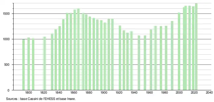 L'évolution du nombre d'habitants est connue à travers les recensements de la population effectués dans la commune depuis 1793. Pour les communes de moins de 10 000 habitants, une enquête de recensement portant sur toute la population est réalisée tous les cinq ans, les populations de référence des années intermédiaires étant quant à elles estimées par interpolation ou extrapolation[15]. Pour la commune, le premier recensement exhaustif entrant dans le cadre du nouveau dispositif a été réalisé en 2008[16].