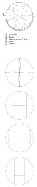 La mèche est donc liée à d'autres pièces de bois par un système d'entailles, d'adents et d'écarts, dont la combinaison constitue la solidité nécessaire[1],[5]; sur la mèche on forme des adents saillants et rentrants pour recevoir les adents correspondants des autres pièces qu'on assemble dans la confection arrondie de ce mât[5]. Le plus gros bout de la mèche restant entier fournit le ton (tête du mât) nécessaire au mât; lorsqu'un mât brut n'est pas assez long pour faire une mèche en entier on le joint à un autre par un écart très longs[5].
