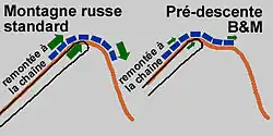 Une particularité que l'on retrouve sur presque toute la ligne de production de montagnes russes B&M, consiste en un élément nommé la pré-descente (pre-drop). Il s'agit d'une toute petite descente en haut de la première remontée par la chaîne de traction (lift hill) avant la fameuse première côte.