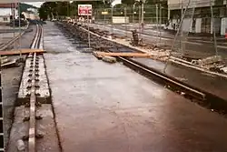 Un aiguillage sur la voie du TVR, à proximité de l'arrêt "Saint-Georges". Les deux rails étaient sur une plaque commune, qui pivotait en fonction du rail à aligner. Cet aiguillage était abandonné[11] depuis 2005, et a en conséquence été soudé sur le rail encore en service.
