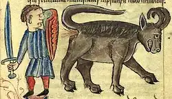 « In Asia an animal is found which men call bonnacon. It has the head of a bull, and thereafter its whole body is of the size of a bull's with the maned neck of a horse. Its horns are convoluted, curling back on themselves in such a way that if anyone comes up against it, he is not harmed. But the protection which its forehead denies this monster is furnished by its bowels. For when it turns to flee, it discharges fumes from the excrement of its belly over a distance of three acres, the heat of which sets fire to anything it touches. In this way, it drives off its pursuers with its harmful excrement. »