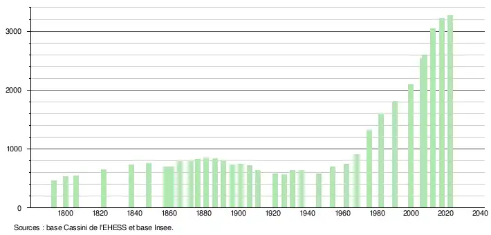L'évolution du nombre d'habitants est connue à travers les recensements de la population effectués dans la commune depuis 1793. Pour les communes de moins de 10 000 habitants, une enquête de recensement portant sur toute la population est réalisée tous les cinq ans, les populations de référence des années intermédiaires étant quant à elles estimées par interpolation ou extrapolation[13]. Pour la commune, le premier recensement exhaustif entrant dans le cadre du nouveau dispositif a été réalisé en 2007[14].