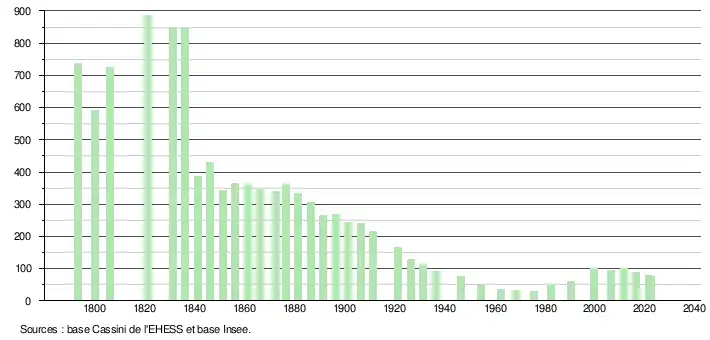 L'évolution du nombre d'habitants est connue à travers les recensements de la population effectués dans la commune depuis 1793. Pour les communes de moins de 10 000 habitants, une enquête de recensement portant sur toute la population est réalisée tous les cinq ans, les populations de référence des années intermédiaires étant quant à elles estimées par interpolation ou extrapolation[31]. Pour la commune, le premier recensement exhaustif entrant dans le cadre du nouveau dispositif a été réalisé en 2006[32].