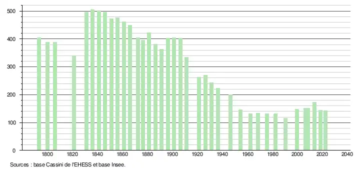 - ↑ Population municipale de référence en vigueur au 1er janvier 2025, millésimée 2022, définie dans les limites territoriales en vigueur au 1er janvier 2024, date de référence statistique : 1er janvier 2022.