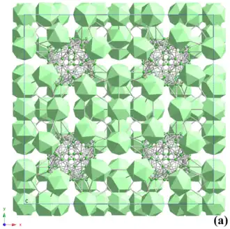 (a) Unité de 13 icosaèdres B12 ((B12)13 ou supericosaèdre), et (b) unité cluster de B80 de la structure de YB66. Le nombre excessif de liaisons (dans l'image 9B) résulte de l'hypothèse que tous les sites sont occupés, alors que le nombre total d'atome de bore est de seulement 42[11]. | ||
