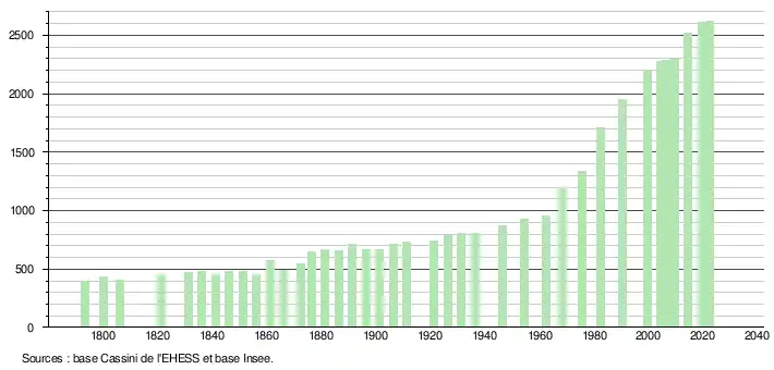 L'évolution du nombre d'habitants est connue à travers les recensements de la population effectués dans la commune depuis 1793. Pour les communes de moins de 10 000 habitants, une enquête de recensement portant sur toute la population est réalisée tous les cinq ans, les populations de référence des années intermédiaires étant quant à elles estimées par interpolation ou extrapolation[25]. Pour la commune, le premier recensement exhaustif entrant dans le cadre du nouveau dispositif a été réalisé en 2004[26].