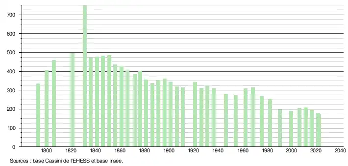L'évolution du nombre d'habitants est connue à travers les recensements de la population effectués dans la commune depuis 1793. Pour les communes de moins de 10 000 habitants, une enquête de recensement portant sur toute la population est réalisée tous les cinq ans, les populations de référence des années intermédiaires étant quant à elles estimées par interpolation ou extrapolation[31]. Pour la commune, le premier recensement exhaustif entrant dans le cadre du nouveau dispositif a été réalisé en 2006[32].