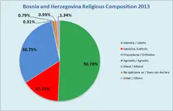 La Bosnie-Herzégovine est une république fédérale séculière de près de 3,5 millions d'habitants, désignés comme Bosniens. Ceux-ci sont divisés en trois principaux groupes ethniques qui parlent la même langue slave méridionale : le chtokavien, un parler de ce que les linguistes nomment « diasystème slave du centre-sud », jadis appelé « serbo-croate » et aujourd'hui « BCMS » d'après ses trois noms officiels actuels, bosnien pour les Bosniaques, croate pour les Croates de Bosnie-Herzégovine et serbe pour les Serbes de Bosnie (auxquels il faut ajouter les Monténégrins). Ces trois peuples sont désignés comme « peuples constitutifs » par la constitution, et définis d'après leur histoire et leurs traditions culturelles : musulmane sunnite pour les Bosniaques, chrétienne catholique pour les Croates de Bosnie et chrétienne orthodoxe pour les Serbes de Bosnie[13].