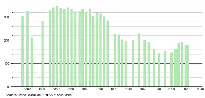 L'évolution du nombre d'habitants est connue à travers les recensements de la population effectués dans la commune depuis 1793. Pour les communes de moins de 10 000 habitants, une enquête de recensement portant sur toute la population est réalisée tous les cinq ans, les populations de référence des années intermédiaires étant quant à elles estimées par interpolation ou extrapolation[21]. Pour la commune, le premier recensement exhaustif entrant dans le cadre du nouveau dispositif a été réalisé en 2004[22].