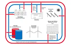 Contrairement à de nombreux projets classiques, la chaleur n'y est pas utilisée directement (on parle d'un système décentralisé) : la boucle d'eau tempérée sert de fluide primaire à des pompes à chaleur qui amènent les circuits secondaires (ceux situés à l'intérieur des bâtiments) à la température voulue pour le chauffage et éventuellement la production d'eau chaude sanitaire. Après passage dans la pompe à chaleur, la température de la boucle d'eau tempérée est abaissée ; mais cette eau plus froide est également utilisée comme fluide primaire pour des pompes à chaleur effectuant de la climatisation (notamment pour des centre de données, ou plus généralement des bâtiments tertiaires ayant des besoins en climatisation), qui élèvent la température de la boucle[2],[4].