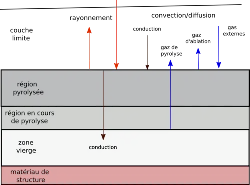 De nombreux matériaux contiennent une ou plusieurs résines qui se décomposent sous l'effet de la chaleur. Ce phénomène de pyrolyse est endothermique. Au cours de cette décomposition, une partie est transformée en carbone, environ 50 % dans le cas d'une résine phénolique. L'autre partie se transforme en gaz qui migrent vers la surface où ils participent au phénomène de blocage. Ce phénomène ne modifie pas qualitativement les mécanismes globaux décrits ci-dessus mais alourdit considérablement le problème du fait des nombreuses espèces chimiques créées et injectées dans la couche limite.