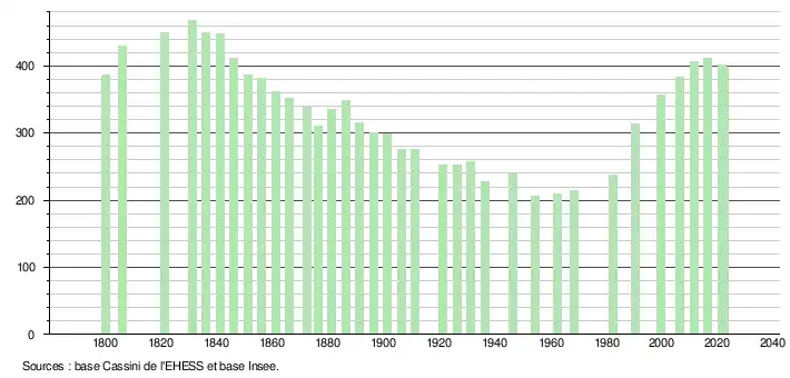 L'évolution du nombre d'habitants est connue à travers les recensements de la population effectués dans la commune depuis 1800. Pour les communes de moins de 10 000 habitants, une enquête de recensement portant sur toute la population est réalisée tous les cinq ans, les populations de référence des années intermédiaires étant quant à elles estimées par interpolation ou extrapolation[20]. Pour la commune, le premier recensement exhaustif entrant dans le cadre du nouveau dispositif a été réalisé en 2006[21].