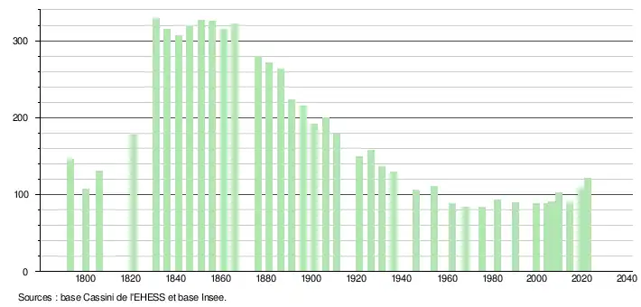 | L'évolution du nombre d'habitants est connue à travers les recensements de la population effectués dans la commune depuis 1793. Pour les communes de moins de 10 000 habitants, une enquête de recensement portant sur toute la population est réalisée tous les cinq ans, les populations de référence des années intermédiaires étant quant à elles estimées par interpolation ou extrapolation[25]. Pour la commune, le premier recensement exhaustif entrant dans le cadre du nouveau dispositif a été réalisé en 2004[26]. En 2022, la commune comptait 121 habitants[Note 4], en évolution de +40,7 % par rapport à 2016 (Hautes-Pyrénées : +1,59 %, France hors Mayotte : +2,11 %). |