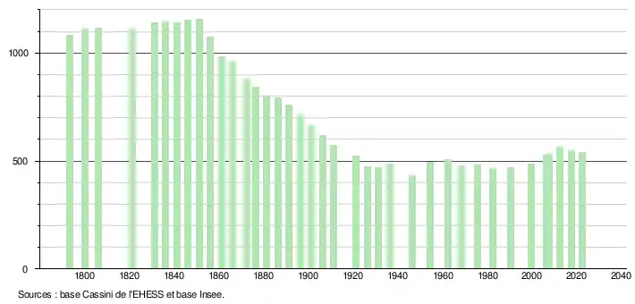 L'évolution du nombre d'habitants est connue à travers les recensements de la population effectués dans la commune depuis 1793. Pour les communes de moins de 10 000 habitants, une enquête de recensement portant sur toute la population est réalisée tous les cinq ans, les populations de référence des années intermédiaires étant quant à elles estimées par interpolation ou extrapolation[23]. Pour la commune, le premier recensement exhaustif entrant dans le cadre du nouveau dispositif a été réalisé en 2007[24].