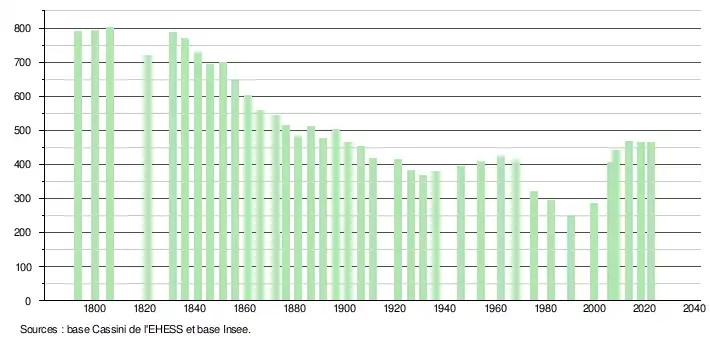 L'évolution du nombre d'habitants est connue à travers les recensements de la population effectués dans la commune depuis 1793. Pour les communes de moins de 10 000 habitants, une enquête de recensement portant sur toute la population est réalisée tous les cinq ans, les populations de référence des années intermédiaires étant quant à elles estimées par interpolation ou extrapolation[29]. Pour la commune, le premier recensement exhaustif entrant dans le cadre du nouveau dispositif a été réalisé en 2008[30].