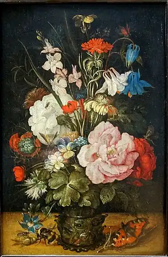 Les fleurs de ce bouquet, à peine écloses, épanouies ou déjà fanées, illustrent le cycle de la vie et suggèrent l'inexorable écoulement du temps. Comme dans nombre de peintures du début du XVIIe siècle, des spécimens fleurissant à différents moments de l'année s'y côtoient. Par ce dépassement de la réalité, le peintre peut avoir voulu évoquer le cycle des saisons ou surpasser le Créateur[1].