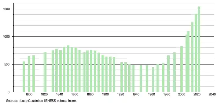 L'évolution du nombre d'habitants est connue à travers les recensements de la population effectués dans la commune depuis 1793. Pour les communes de moins de 10 000 habitants, une enquête de recensement portant sur toute la population est réalisée tous les cinq ans, les populations de référence des années intermédiaires étant quant à elles estimées par interpolation ou extrapolation[22]. Pour la commune, le premier recensement exhaustif entrant dans le cadre du nouveau dispositif a été réalisé en 2008[23].