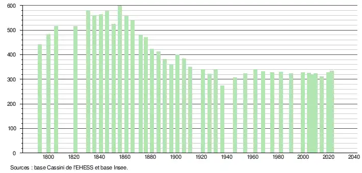 L'évolution du nombre d'habitants est connue à travers les recensements de la population effectués dans la commune depuis 1793. Pour les communes de moins de 10 000 habitants, une enquête de recensement portant sur toute la population est réalisée tous les cinq ans, les populations de référence des années intermédiaires étant quant à elles estimées par interpolation ou extrapolation[16]. Pour la commune, le premier recensement exhaustif entrant dans le cadre du nouveau dispositif a été réalisé en 2004[17].