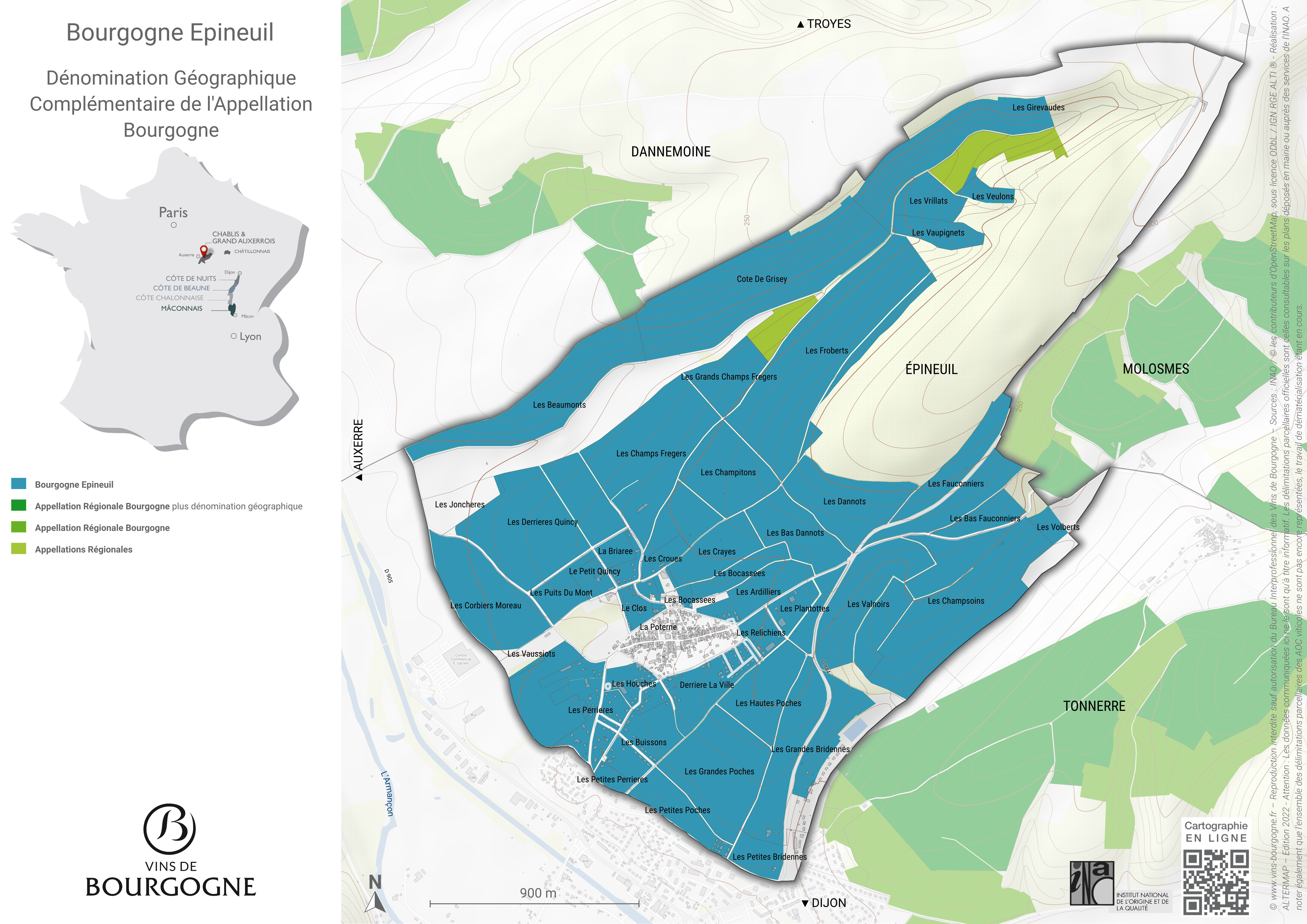 | Carte de l'aire de production du bourgogne épineuil, indiquant les différents climats | |