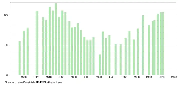 L'évolution du nombre d'habitants est connue à travers les recensements de la population effectués dans la commune depuis 1793. Pour les communes de moins de 10 000 habitants, une enquête de recensement portant sur toute la population est réalisée tous les cinq ans, les populations de référence des années intermédiaires étant quant à elles estimées par interpolation ou extrapolation[27]. Pour la commune, le premier recensement exhaustif entrant dans le cadre du nouveau dispositif a été réalisé en 2008[28].