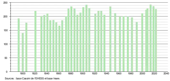 L'évolution du nombre d'habitants est connue à travers les recensements de la population effectués dans la commune depuis 1793. Pour les communes de moins de 10 000 habitants, une enquête de recensement portant sur toute la population est réalisée tous les cinq ans, les populations de référence des années intermédiaires étant quant à elles estimées par interpolation ou extrapolation[43]. Pour la commune, le premier recensement exhaustif entrant dans le cadre du nouveau dispositif a été réalisé en 2008[44].