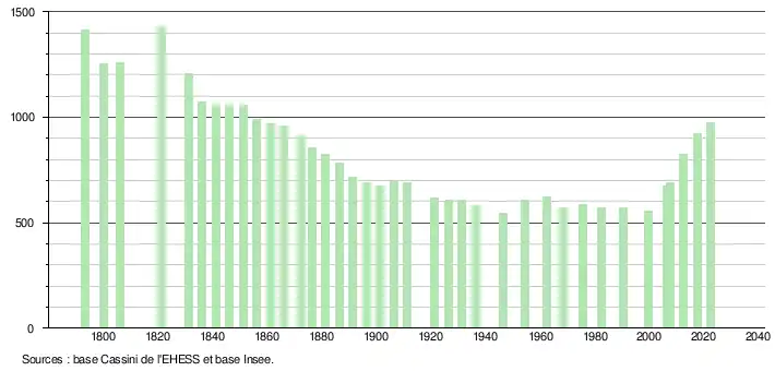 En 1638 : de 1100 à 1200 habitants ; en 1789 : de 1300 à 1400 habitants. À partir de cette date, soit par suite de la réduction du territoire, soit pour des raisons d’ordre économique, la population ne cesse de diminuer (1841 : 1057 hab., 1882 : 825 hab., 1908 : 698 hab., 1999 : 564 hab et de nos jours 841 habitants.